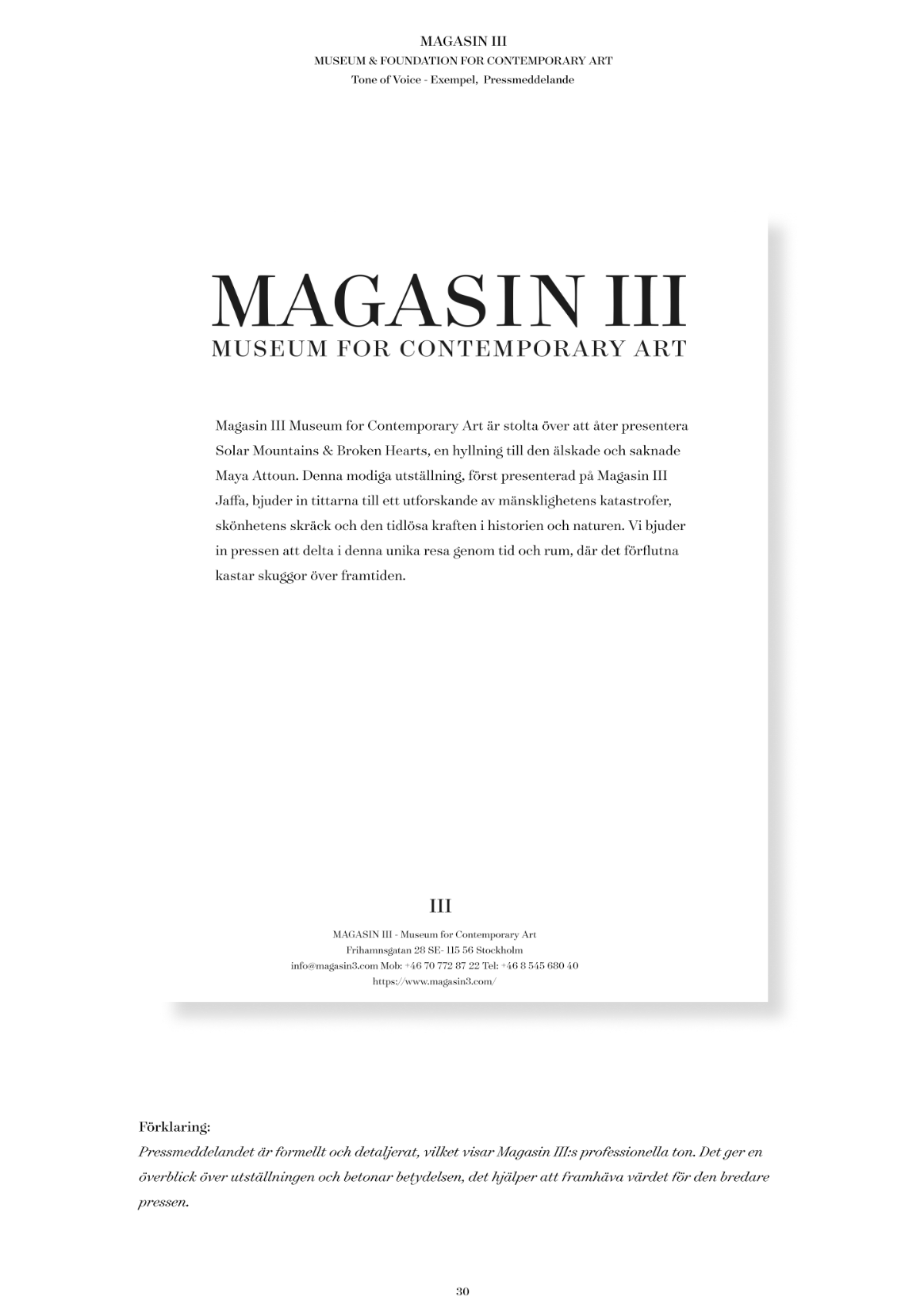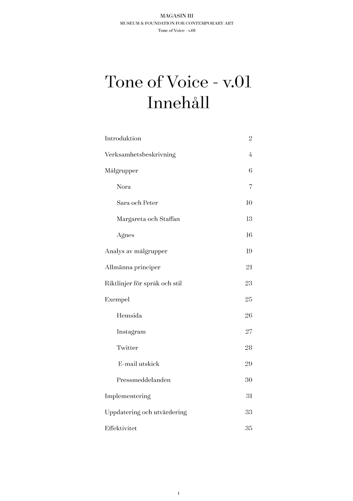 Projektbeskrivning: I nära samarbete med kommunikationsteamet och museichefen utvecklade jag en ny Tone of Voice (ToV) för Magasin III, med fokus på att spegla museets värderingar och engagemang för samtidskonst. Genom en heldagsworkshop med personalen skapade jag en ToV-guide som fungerar som grund för all deras framtida kommunikation, både externt och internt.